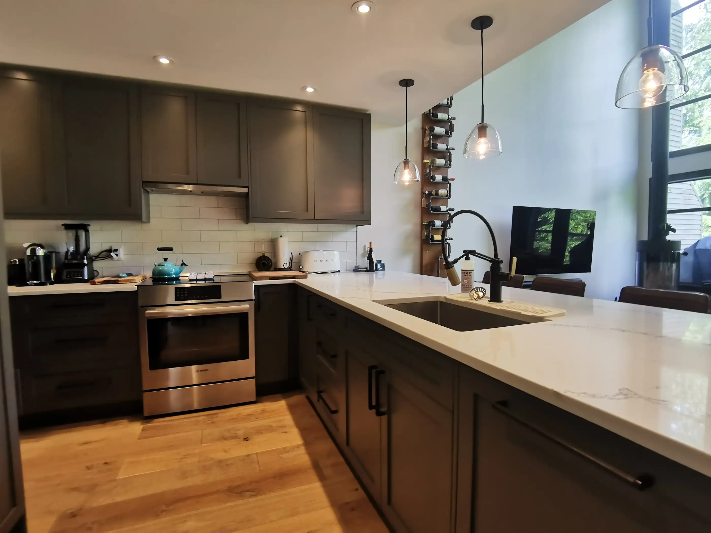 We undertook a complete renovation including reframing and adjusting the layout of this property. We installed new flooring/tile/carpet/hardwood throughout, added and redid the electrical & lighting and finished the trim out with custom millwork and a unique and custom sauna.